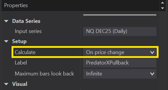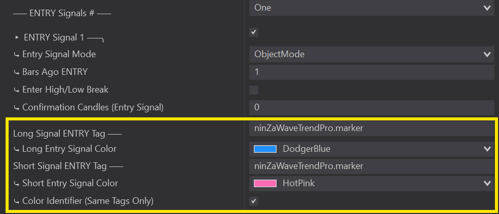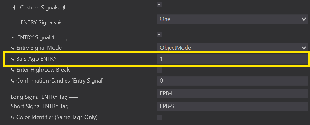 ⤷ 99% of signals require Bars Ago ENTRY with a value of ‘1’. This means that as soon as a new bar opens, it will detect a signal from one bar to the immediate left.