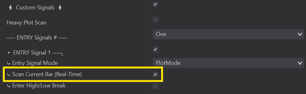 Inside the Custom Signal Section you will see an option for ‘Scan Current Bar’. This option is used to enter trades the moment your Parameters are met instead of waiting for the Bar the close.
