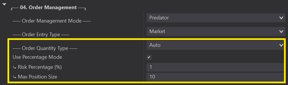 Order QTY Calculate is used to set your position size for each trade that you take with the Predator.